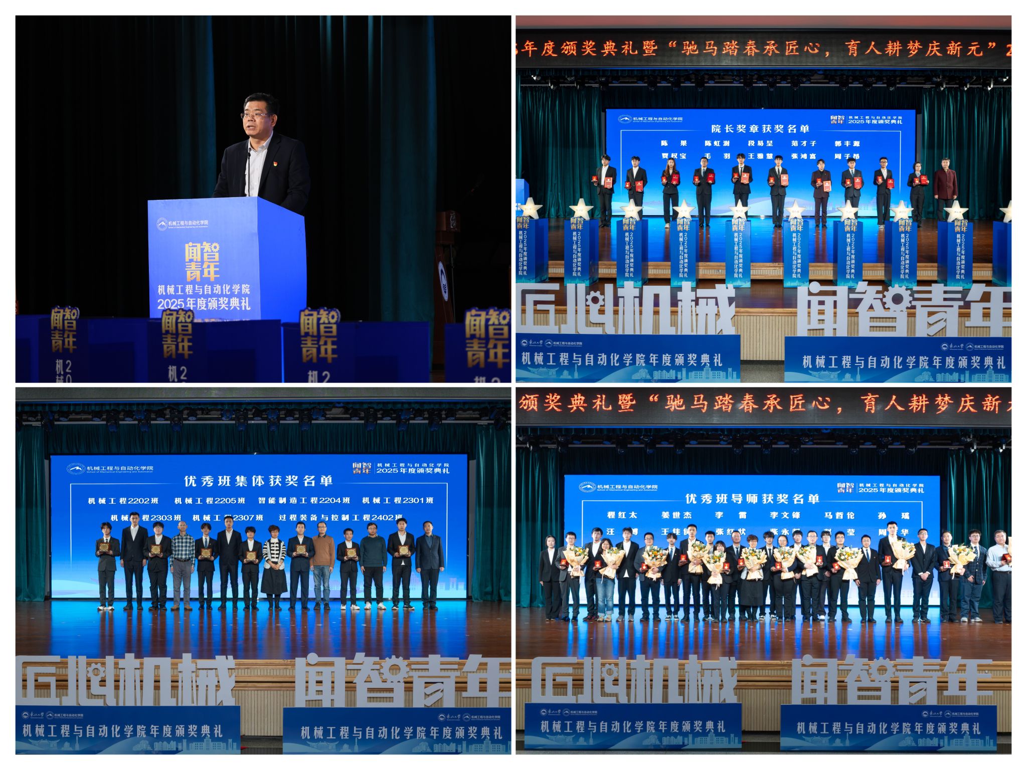 学院党委郝建山正在致辞中系统回首了一年来学院取得的主要成绩。学院积极办事国度计谋,并正在环节科研范畴实现标记性冲破,获得国度严沉专项支撑。同时,学院成功引进增材取激光制制范畴领军团队,稳步推进学校新增学位点扶植,为久远成长奠基根本。正在人才培育方面,学院学子表示凸起,研究生学术丰盛,正在“挑和杯”“中国国际大学生立异大赛”等多项赛事中斩获国度级项,结业生就业率持续连结高位,展示了全面成长的优良素养。郝建山阐释了“闻智青年”品牌的育人内涵,勉励全体师生胸怀“国之大者”,将小我成长融入“制制强国”计谋,过硬本事,怯于立异创制,勤奋成为担任平易近族回复大任的时代新人。副院长罗忠表扬决定。颁环节分三轮顺次进行。起首颁布的是“院长章”,刘云飞为毛羽等10名正在专业进修、社会实践等方面表示杰出的学生颁布章。随后颁布“优良班集体”项,班导师代表为7个正在班风、学风及凝结力扶植中成效显著的班级颁。最初,仪式聚焦育人一线论理学生代表向获评“优良班导师”的教员们献上鲜花取荣誉证书,表达诚挚感谢感动。“院长章”获得者代表毛羽连系科研竞赛取意愿办事履历,讲述了“道阻且长,行则将至”的成长;“优良班集体”获代表豆煜轩分享了班级凝心聚力、共建优秀学风的活泼经验。正在“闻智匠心 共话青蓝”出格环节,从分歧视角展示了师生间思惟引领、学业互帮、讲授相长的温情互动,彰显了育人一线的深挚交谊取结实成效。据悉,“闻智青年”是机械工程取从动化学院出力打制的文化育人品牌。本次颁仪式既是年度的集中展现,也是典型树立、激励朝上进步的主要平台,旨正在指导全体学生以先辈为楷模,坚想、夯实专业根本、锻制立异能力,全球视野取创制活力的杰出工程人才,为学校“双一流”扶植和高质量成长注入芳华力量。